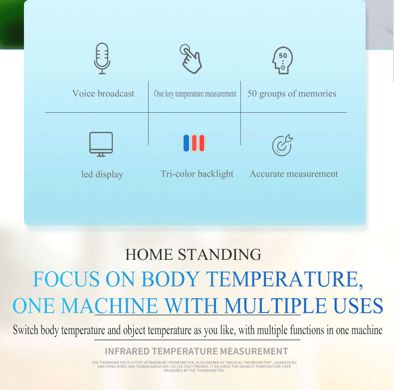 1. Teknologi inframerah canggih dari penyedia IC terkemuka, Pengujian dahi tanpa kontak, sangat higienis dan aman.